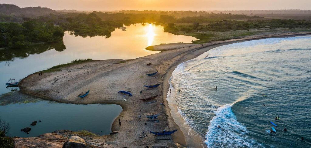 Just 3 kilometers and a 15 minute Tuk Tuk ride away from Arugam Bay is a beautiful beach that is visited by elephants during sunrise and sunset. The name is because of the natural elephant-shaped, sea-facing rock that promises awesome sunrise or sunset views. The area has two different spots with waves suitable for beginner and expert levels. The island vibe is amazing and you can get to spot elephants, crocodiles, birds, and peacocks. This is one of Arugam Bay’s best-surfing spots. Make sure to carry refreshments as there are no shelters except for an occasional local selling king coconut and water.Crocodile Rock